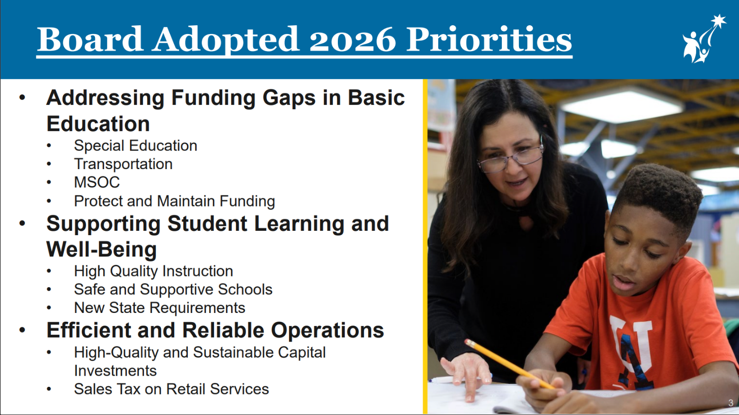SPS slide showing the 2026 board-adoped legislative priorities.