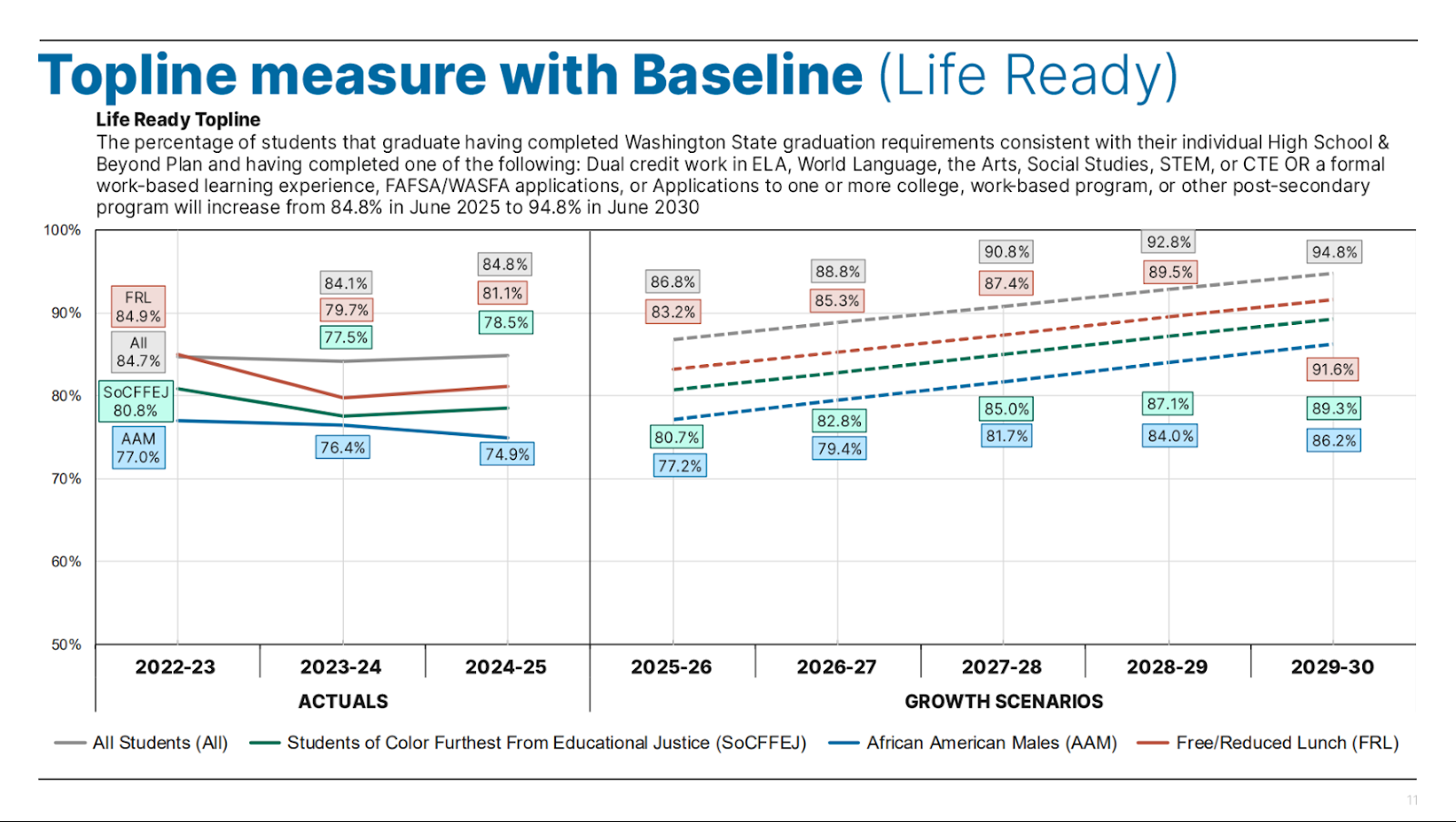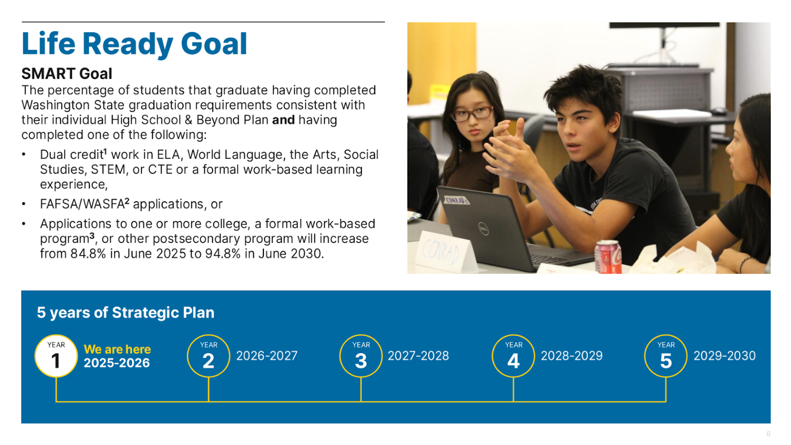 SPS slide detailing the “life ready” board goal. 84.8% of students meet the two-part goal today; the district aims to raise this to 94.8% of students by June 2030.