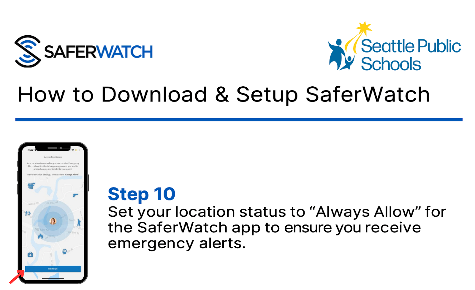 The SPS+SaferWatch installation guide, linked from the district’s website, directs users to allow SaferWatch always-on access to their real-time location: