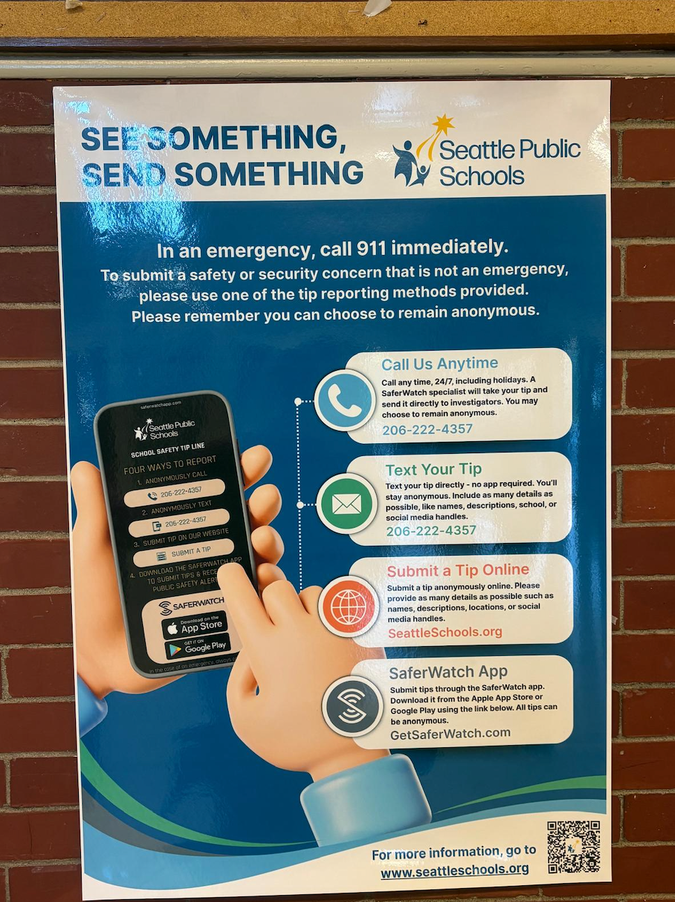 Printed posters in SPS hallways titled, “See Something, Send Something,” give students four digital avenues for reporting such incidents to SaferWatch.