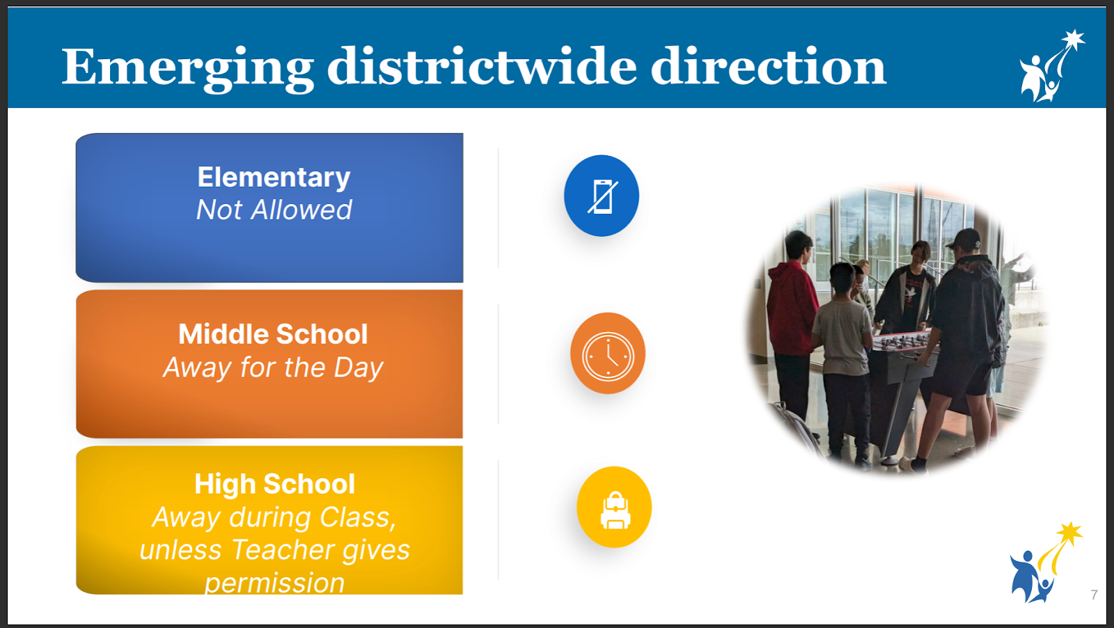 Here is a link to the District’s presentation and informational briefing on the development of its district-wide student cellphone and personal device usage policy. Staff detailed the variety of policies around cell phones and personal devices throughout the district and summarized student and staff/school leader feedback from engagement sessions. See the slide below for general current policy: Elementary – Not Allowed, Middle School – Away for the Day, High School – Away during class, unless teacher gives permission.